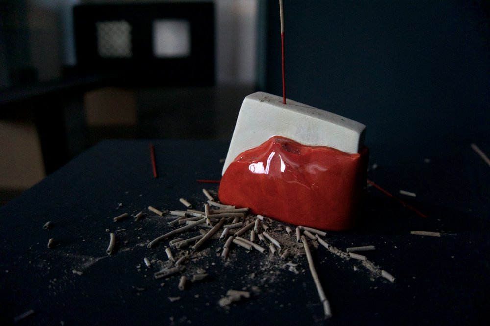We never know what the future has in store happen nor which possibilities will either open or close to us in the next minute. Communication with spirits and souls is a part of daily life in Taiwan, where the artist was invited for a residency. "Bwa Bwei" are moon shaped wooden blocks that serve as a medium in prayer to connect to the world of the deceased. In Untitled (Moon Blocks) (2016), Walkowiak uses 3D-printing to make the moon-shaped wooden blocks appear to float and transit into another dimension. The ceramic object Wedge of Worship (2016) is a slightly modified replica of Duchamp's famous erotic work, Wedge of Chastity (1964), and can be seen as an object of worship - dedicated to the artist's life and work. Walkowiak transformed Duchamp's sculpture into an incense holder of the kind found in temples and shrines in Asia.