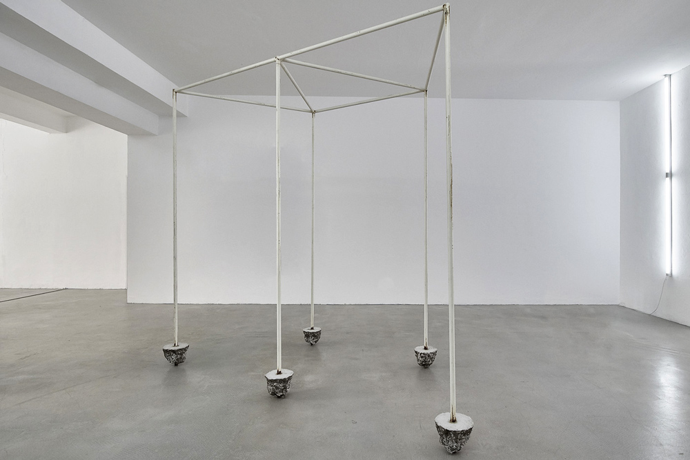 [...] Similar concrete relics appear in one of the sculptural pieces Future Fragments of Past Forms #1 (2014), for which the artist recreated concrete foundations, arranged them in a circle, and connected them with another metal pipe—the result looks like a circular handrail or a kind of jungle gym ripped from its moorings; or one might think of the skeletal structure as the framework for a tent, a sort of primitive hut for the nomadic subject, small and easily movable from one site to another, a form that seems to have been uprooted but is in fact not predestined to put down truly solid roots. The functional indeterminacy opens up a space for possible imaginary applications. The artist makes a sculpture out of found elements—or we might say, the bricoleur constructs a provisional shelter. Such sculptures are nomadic because they are characterized by the potentiality of the temporary abode, but also because their functionality can shift—they are hybrid forms between a purposeless, dysfunctional, formalist sculpture and a possible scaffold for a serviceable dwelling. Walkowiak thus accords to any form an agency, a capacity that renders it an object, a thing, rather than letting it be mere “pure” form.