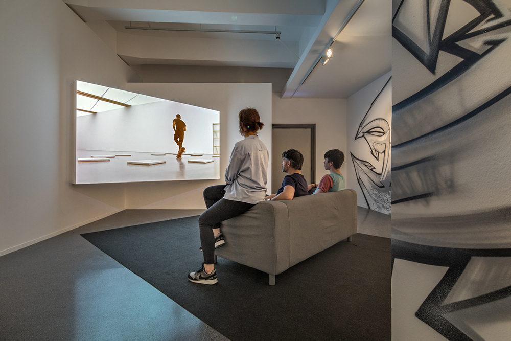An exhibition about concrete wouldn‘t be the same without the subject of skateboarding. Fortunately, the Austrian artist Kay Walkowiak also recognised the rich synergies involved in linking high and skating culture, and went on to film Minimal Vandalism. A classic white cube in which minimalist sculptures are exhibited is the first thing seen. This setting reveals itself as a course for the professional Spanish skater Kilian Martin, who lives in California. He masters the space on three skateboards stacked on top of one another and incorporates the sculptures into his impressive skate performance. Walkowiak has documented Martin‘s athletic appropriation of the space in dynamic shot sequences: the skateboarder acrobatically uses the exhibited objects to demonstrate his skills. He slides and grinds over them, pirouettes and transforms the light yellow block into a halfpipe. Macro shots reveal the many scratches, drag marks and metal fragments that the act of vandalism, namely that of relocating the street tricks to the exhibition space, have left behind on the previously so virginal sculptures.